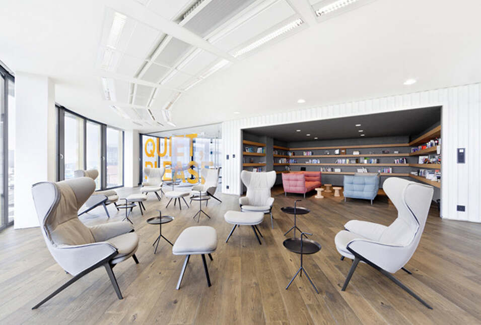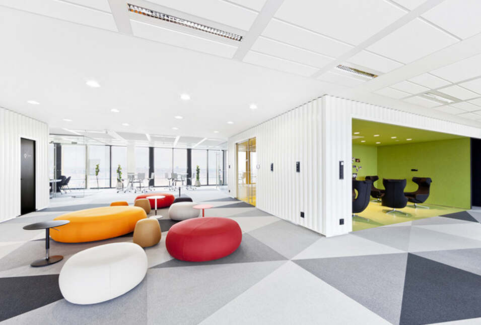 設計介紹:好玩的辦公室,體育館、娛樂室、游戲室、創造放松的空間,石頭型的多彩座椅,更顯趣味性,粉色的沙發是休息的法寶,并且設置的有圖書館,供人們休息室查閱,軟裝的座椅舒適,實用,還有用餐區,木質的座椅更加安全,健康,照片墻以綠色為背景顯得清晰明了,人性化,設計了體育館,員工們健身娛樂。