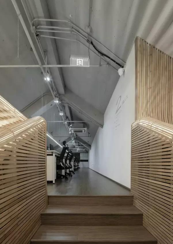 高端文化傳媒辦公室設(shè)計(jì):將竹子的元素運(yùn)用在這里,并還原其本身的色彩。藝術(shù)必須出自于大自然,因?yàn)榇笞匀灰褳槿藗儎?chuàng)造出較獨(dú)特美麗的造型。而竹子作為一種建筑材料代表了古代亞洲建筑體系的內(nèi)涵, 而中國它的產(chǎn)量是足夠支撐裝飾材料的消耗的,并且有著高韌性、可塑性強(qiáng)的特點(diǎn)。在連接頂層的樓梯部分,我們沒有再讓竹子繼續(xù)沿用直線語素。頂面部分做曲線拼接,延續(xù)而上。