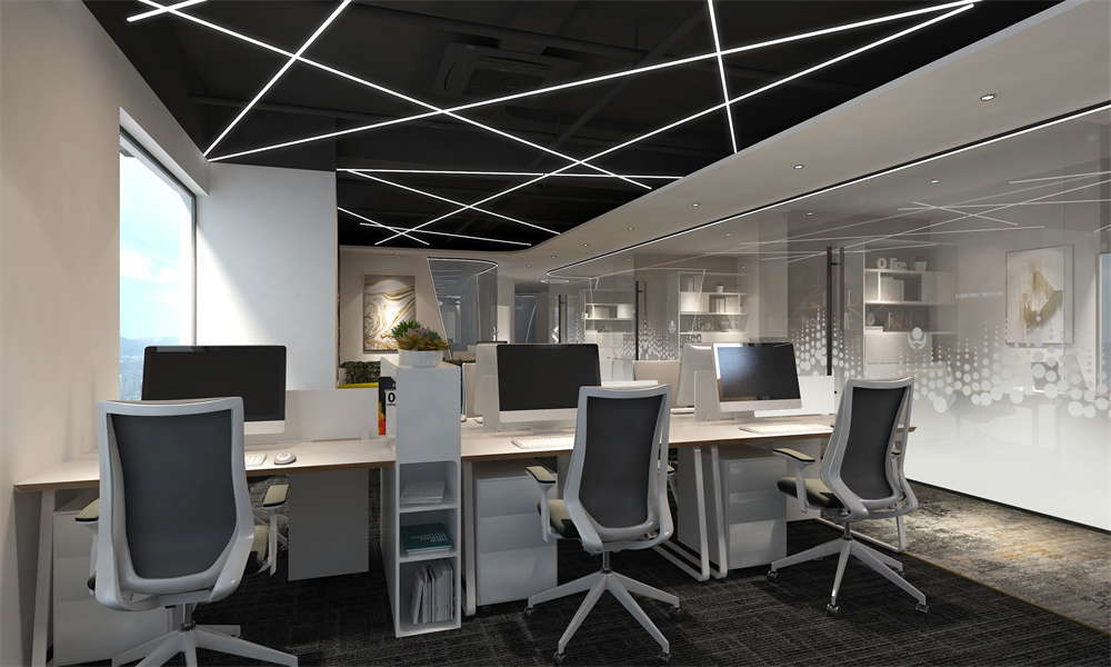開方式辦公區員工常規比較密集,經常有員工反映“燈下黑”的現象,所以在敞開辦公區燈光設計時建議選擇多方位,多角度燈光設計,提倡無主燈概念,區別于以往傳統只靠一盞主燈完成整個空間照明功能的一種設計方式,采用用不同燈具搭配,利用分區組合的方式完成空間照明功能的方式。避免了強光直射的不適感,視覺上更具美感,在空間劃分上,也起到一定視覺輔助作用。既解決了“燈下黑”的照明弊端,在視覺上又不會分隔空間,并不會因此顯得雜亂無章,給人以壓抑感。