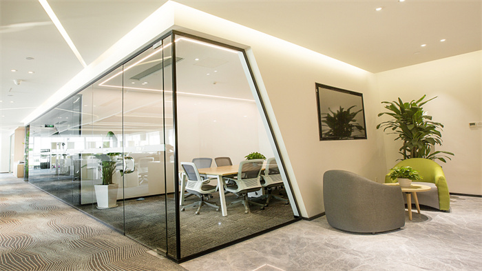 2、其次如何使玻璃隔斷和石膏板墻相結合,哪些墻面可以全部使用玻璃隔斷。這需要我們首先要了解玻璃隔斷的用法。一般來講,在辦公室裝修時,房間與房間之間的隔斷都會使用石膏板隔開,朝外的有門的一面墻則會使用玻璃隔斷和玻璃門。一方面方便辦公室內的采光和延展空間,另一方面可以使空間相對于全部使用石膏板來講更為美觀。對于石膏板墻和玻璃如何結合這種情況,需要具體看辦公室裝修的需求和設計師的設計。例如互聯網公司和科技公司,有些墻面可以使用斜切墻面的方式使斜著的石膏板墻面與玻璃隔墻相結合與整體辦公室的裝修風格相接近,也有一些相對獨立出來的圓形或異型房間則可以全部使用玻璃隔斷,不僅呼應辦公室裝修的整體風格也更為通透。