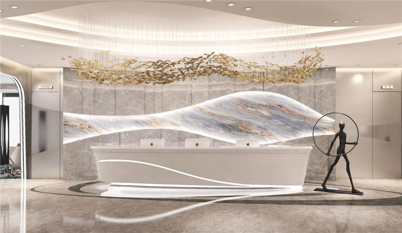 其次要注意功能性設(shè)施的重要性,企業(yè)形象墻與接待臺一般會設(shè)計在同一個地方,位置會選擇在前廳比較顯眼處,大門到接待臺的視覺范圍要寬廣,但距離不要太遠。可以設(shè)計布置等候區(qū)、會客區(qū)或散座,再者在地面或吊頂處使其與其它空間有所區(qū)分,但不要阻隔。