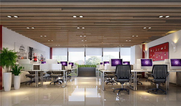 2、整個空間采用的是以暖色調(diào)為主,燈光都是以LED燈為光源,與整個自然光源與人造光源完美的結(jié)合在一塊。員工辦公室裝修設(shè)計:格柵做頂面,空間造型重點一下子就在頂面上。