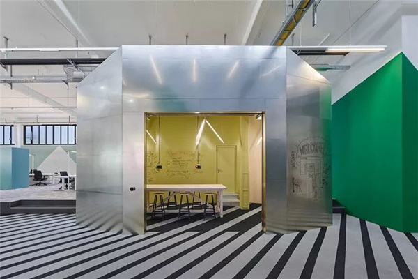 4、創意工業風汽車公司辦公室裝修設計:室內材質的選擇遵從于汽車產業的工業屬性。未加工鋅板、天然木材和鋼材表面共同構筑室內幾何單元。有著半通透質感的聚碳酸酯材料板構筑了室內眾多隔間墻體。聚碳酸酯與原木框架的結合,讓這里呈現出建筑構造較初始的發展狀態中。初始化工業風質感在強烈的色彩映襯下和時尚的家具點綴下,形成鮮明的質感對比,帶來豐富的空間體驗。近似黑白對比的條紋地毯,在空間中不斷演繹著微妙的圖形變化,帶來精彩而時尚的視覺驚艷。